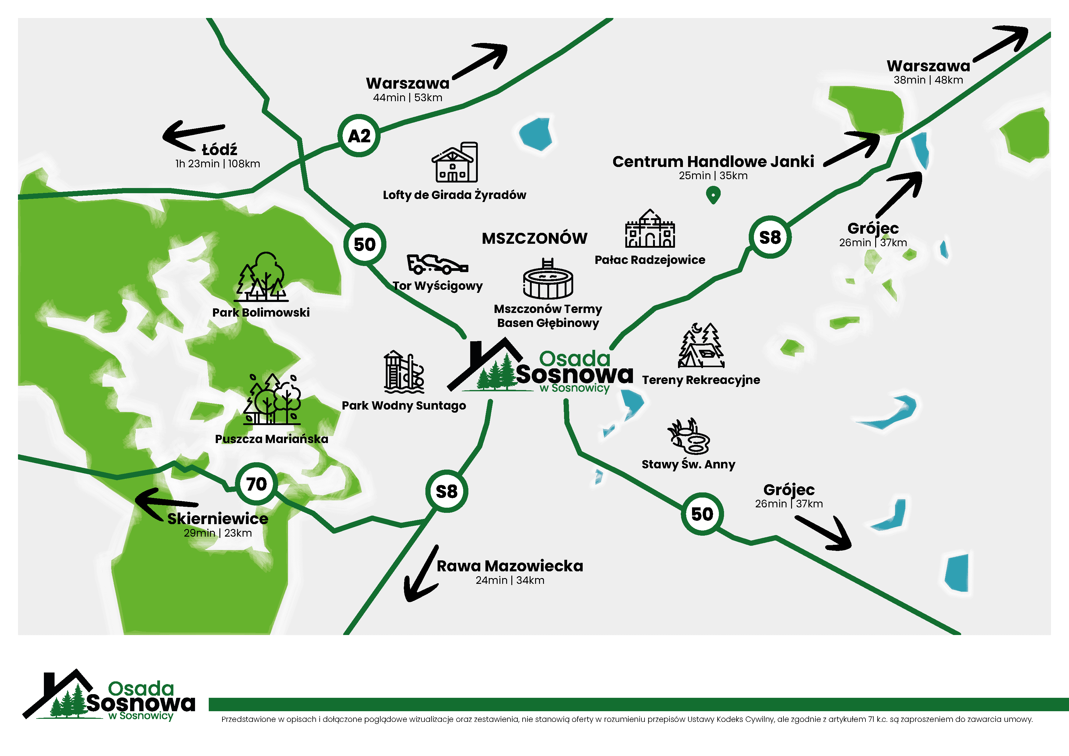 Przedstawione w opisach i dołączone poglądowe wizualizacje oraz zestawienia, nie stanowią oferty w rozumieniu przepisów Ustawy Kodeks Cywilny, ale zgodnie z artykułem 71 k.c. są zaproszeniem do zawarcia umowy.